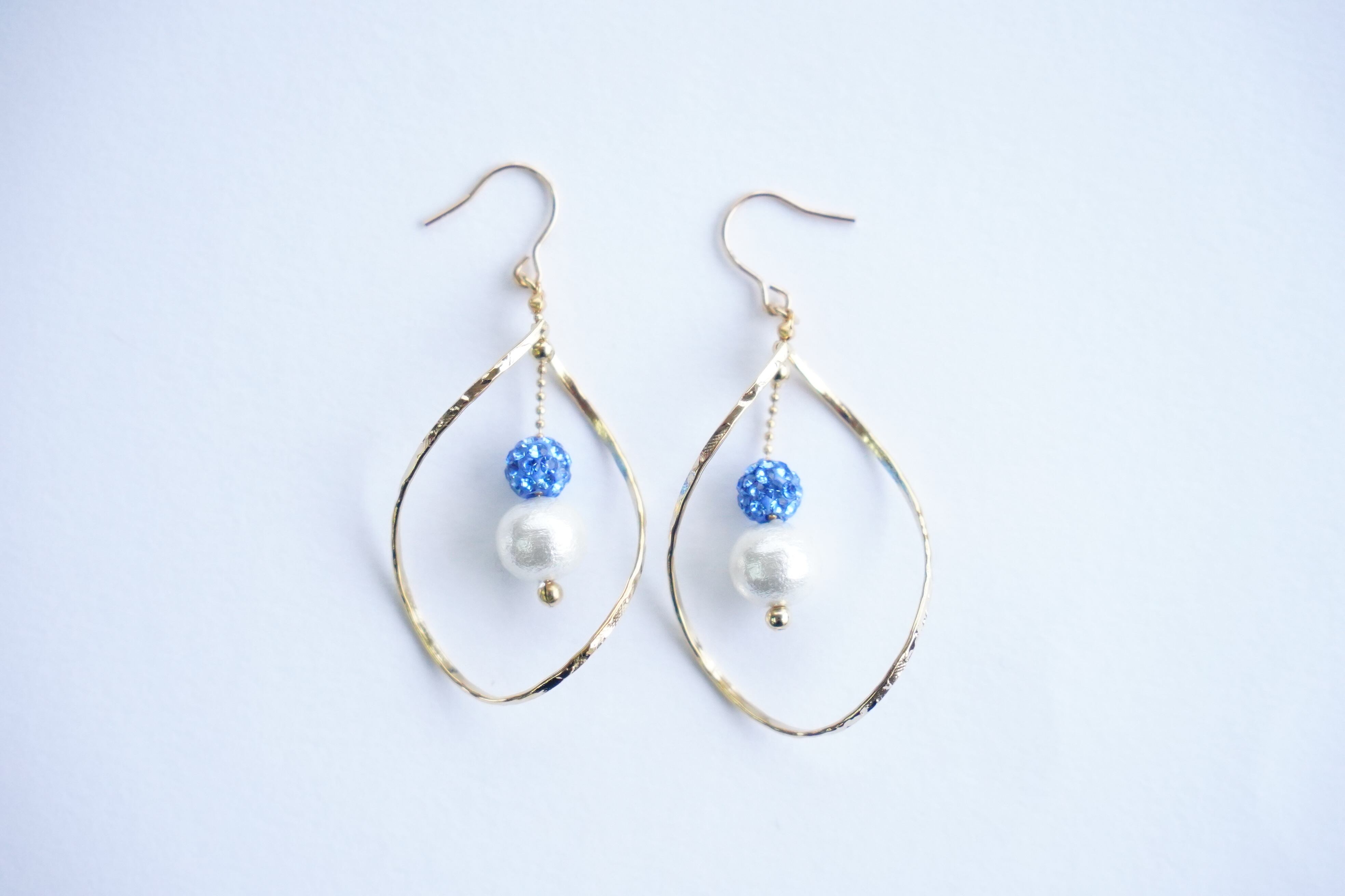 優しい印象のある変形フープで空色のラインストーンボールとホワイトのコットンパールを囲みました