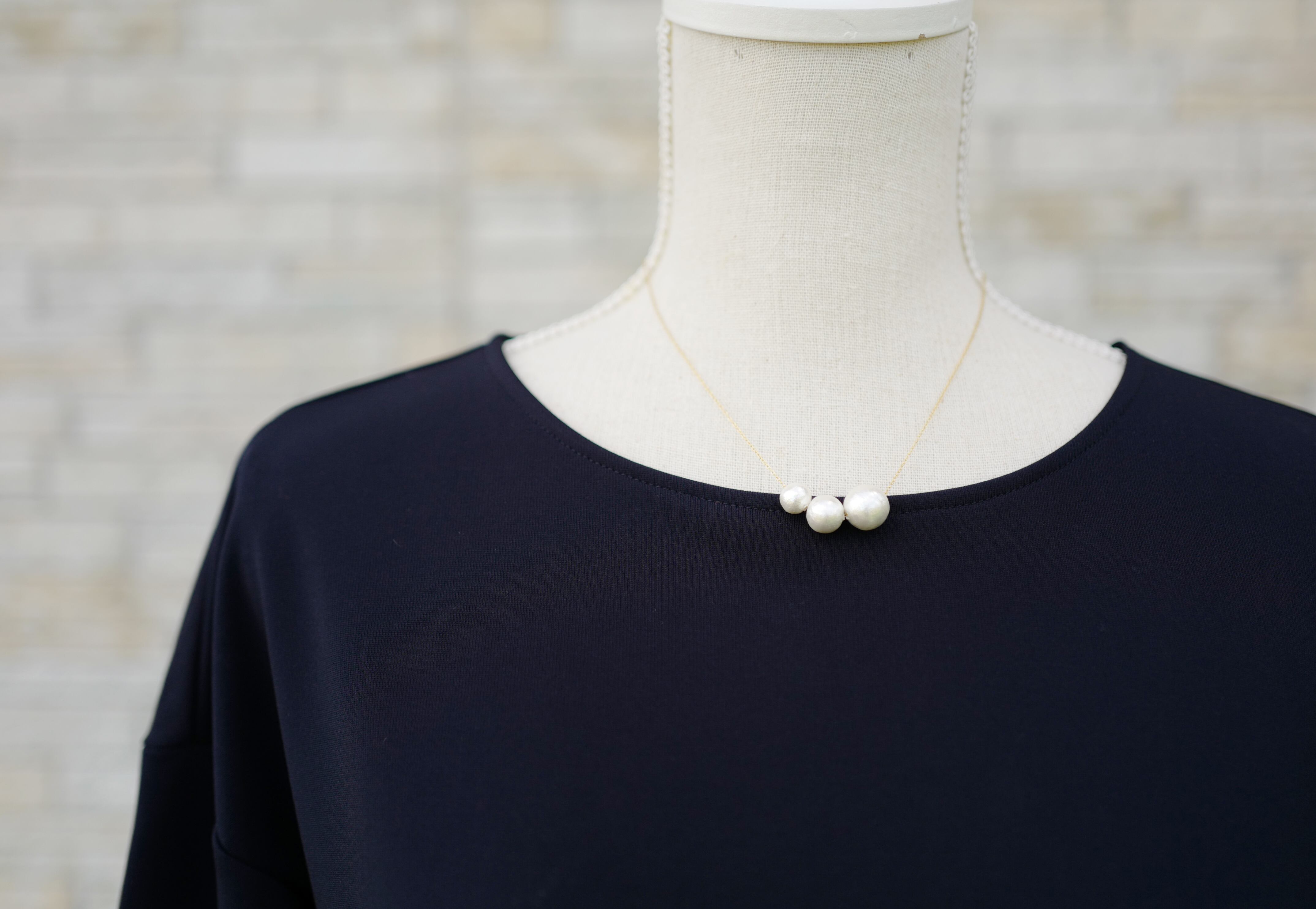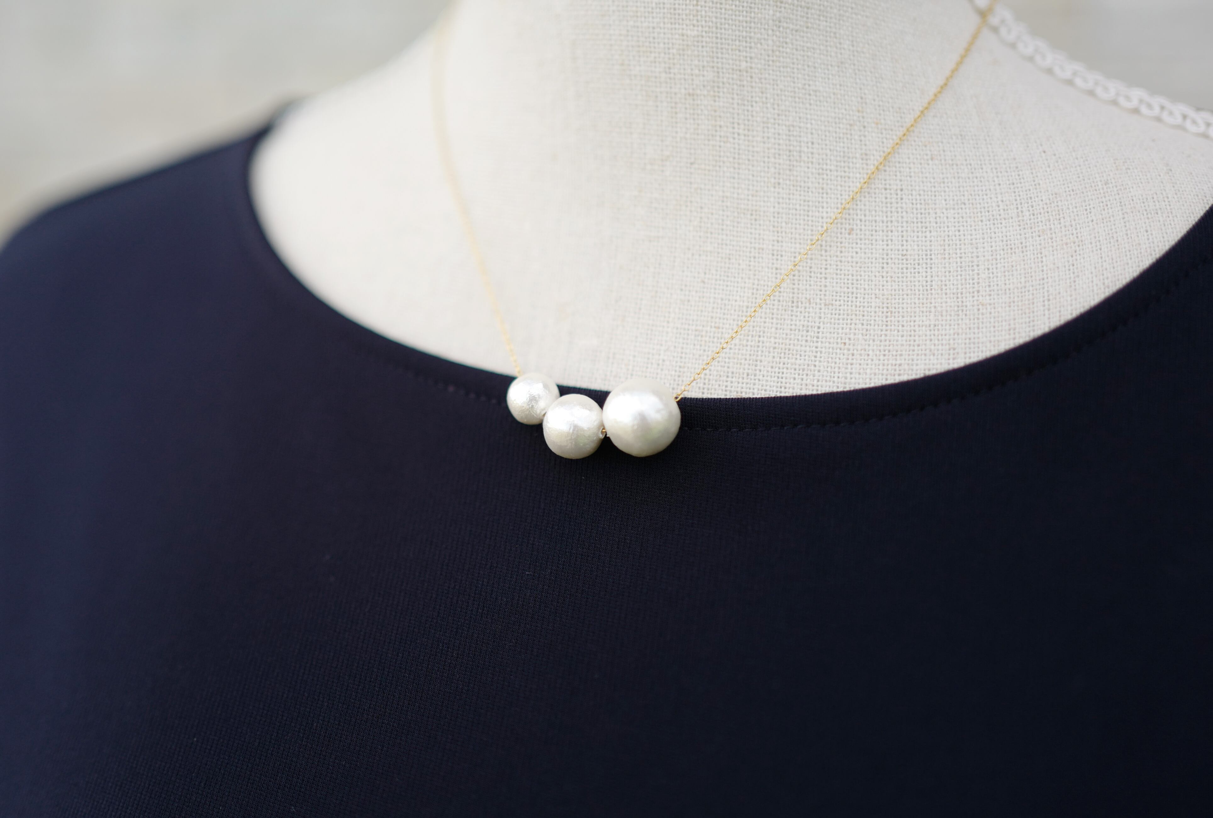 ホワイトのコットンパールが大きさ違いで3粒ついた可愛らしいネックレスです