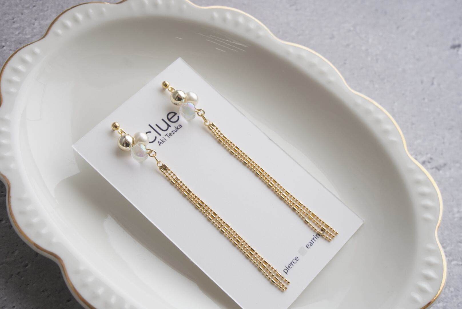 オーロラビーズ、樹脂パール、メタルパーツを細かい泡に見立て、そこから流れるようにエレガントなチェーンのタッセルをおつけしました